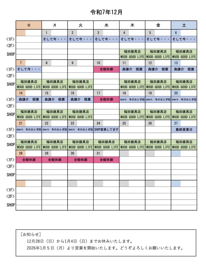 2026年1月 展示&ショップ営業 スケジュール