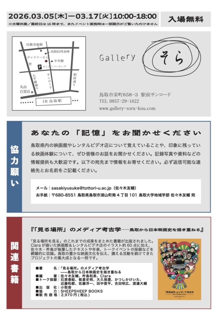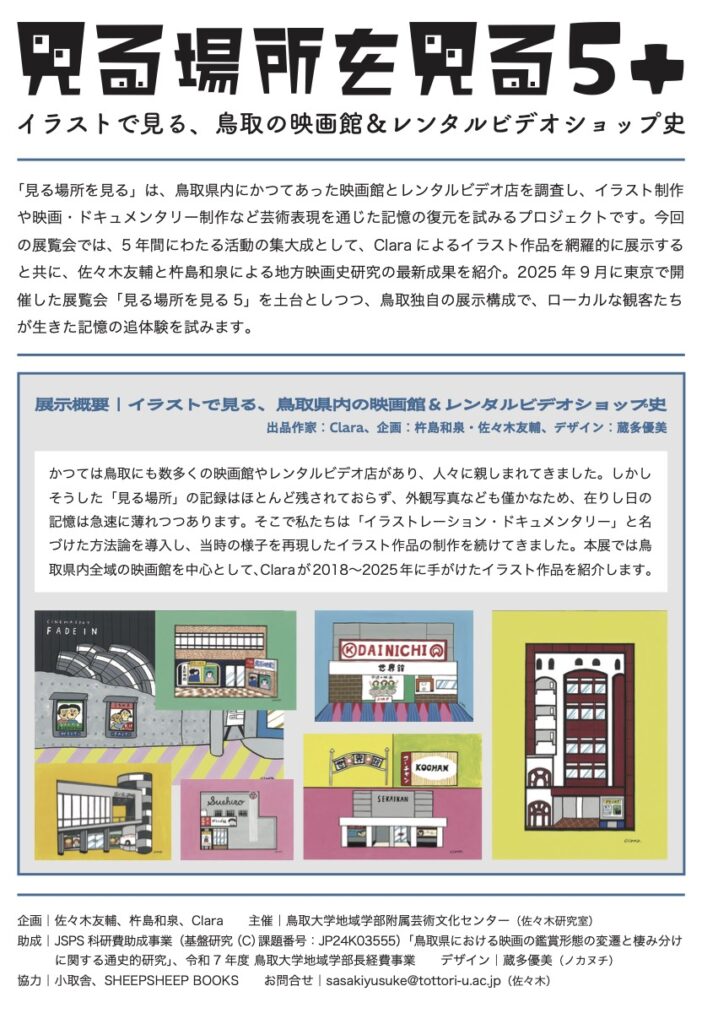 「見る場所を見る」は、鳥取県内にかつてあった映画館とレンタルビデオ店を調査し、イラスト制作や映画・ドキュメンタリー制作など芸術表現を通じた記憶の復元を試みるプロジェクトです。