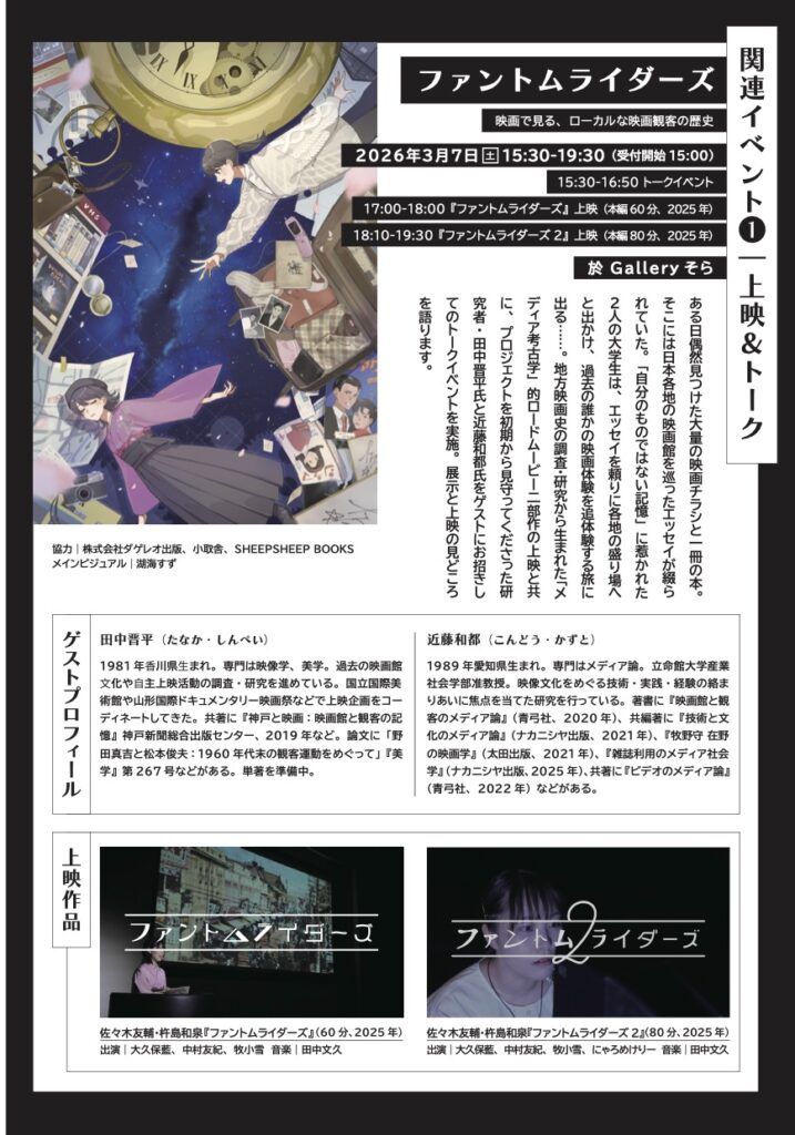 また会期中は、企画者の佐々木友輔さんと杵島和泉さんとの共同制作映画『ファントムライダーズ』2部作の上映会も実施されます。